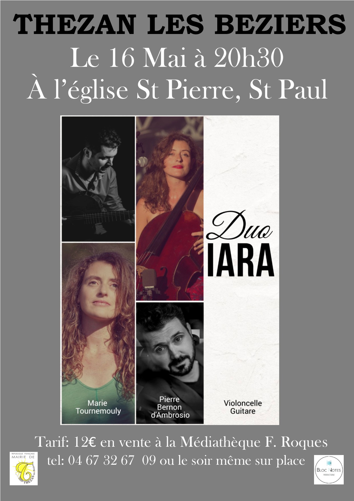 Samedi 16 mai à 20h30 à l’église, concert avec le duo Iara. Violoncelle et guitare. Entrée 12€